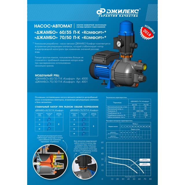 16 500,00 ₽ В наличии В корзину Информация Артикул 83051 Код 00-00215333 Производитель Джилекс Категория каталога Насосные станции Уникальная разработка - насос-автомат «ДЖАМБО» Комфорт комплектуется встроенным регулирующим клапаном, который стабилизирует напор в водопроводной магистрали при изменении расхода воды. Пользователь больше не столкнется с проблемой изменения напора воды при одновременном использовании нескольких кранов. Предназначен для подачи воды из колодцев, неглубоких скважин, открытых водоемов, а также для повышения давления в сетях центрального водоснабжения. Создает комфортные условия пользования водой при пониженном давлении в трубопроводе и стабилизирует напор воды в системе водоснабжения при изменениях параметров потребления. Для управления работой насоса применяется блок автоматики, контролирующий наличие потока воды и защищающий насос от работы по «сухому ходу» Максимальный напор, м 35 Максимальный расход, л/мин 70 Присоединительный размер, дюйм 1 Напряжение сети, В 220±10% Степень защиты, IP X4 Потребляемый ток не более, А 5 Потребляемая мощность, Вт 1100 Длина электрокабеля, м 0,8 Мах.глубина всасывания